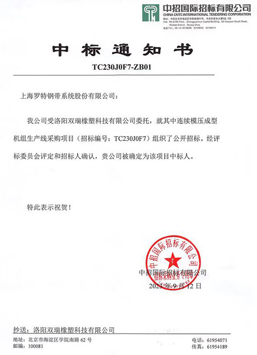 近日,上海羅特鋼帶系統(tǒng)股份有限公司一舉中標了洛陽雙瑞橡塑科技有限公司的連續(xù)模壓成型機組生產(chǎn)線采購項目。此次順利中標,是公司全體同仁上下齊心、協(xié)同作戰(zhàn)的共同結果。我們也將以此為契機,繼續(xù)秉承優(yōu)質高效的客戶服務理念,為客戶提供保質保量的產(chǎn)品!