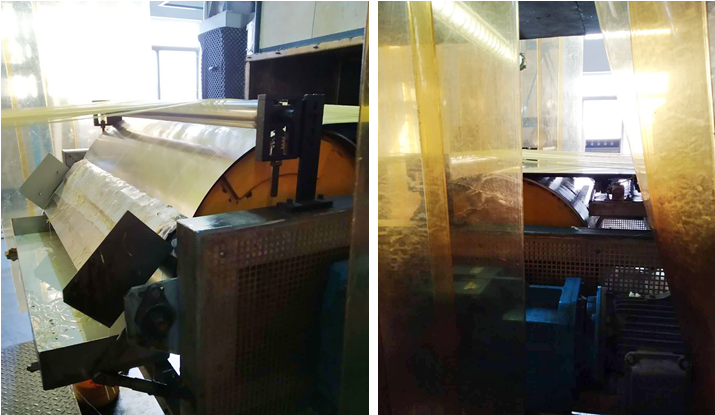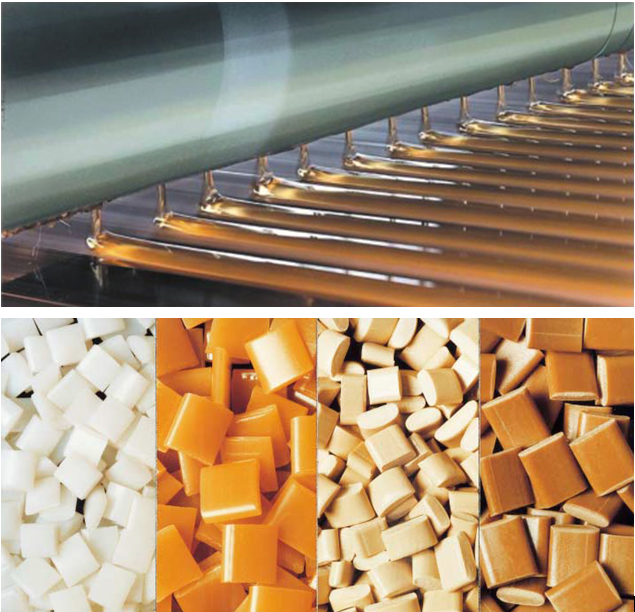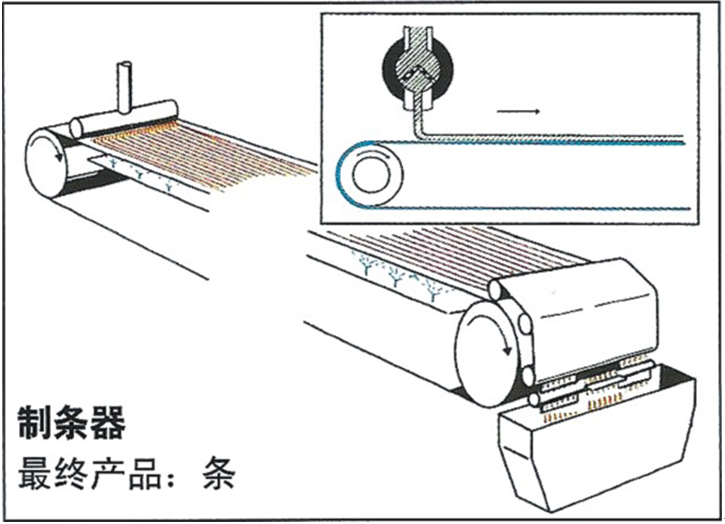 鋼帶式冷凝造條裝置是利用物料的低熔點(diǎn)特性,通過固定開孔下料方式將熔融液均布在其下方勻速移動的鋼帶上,在鋼帶下方設(shè)置的連續(xù)噴淋裝置的冷卻作用下,使物料在移動、輸送過程中得以冷卻、固化,從而達(dá)到造條目的。